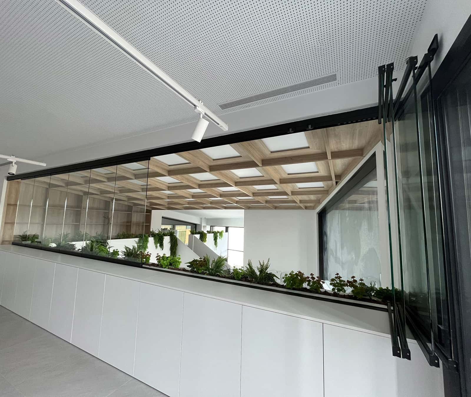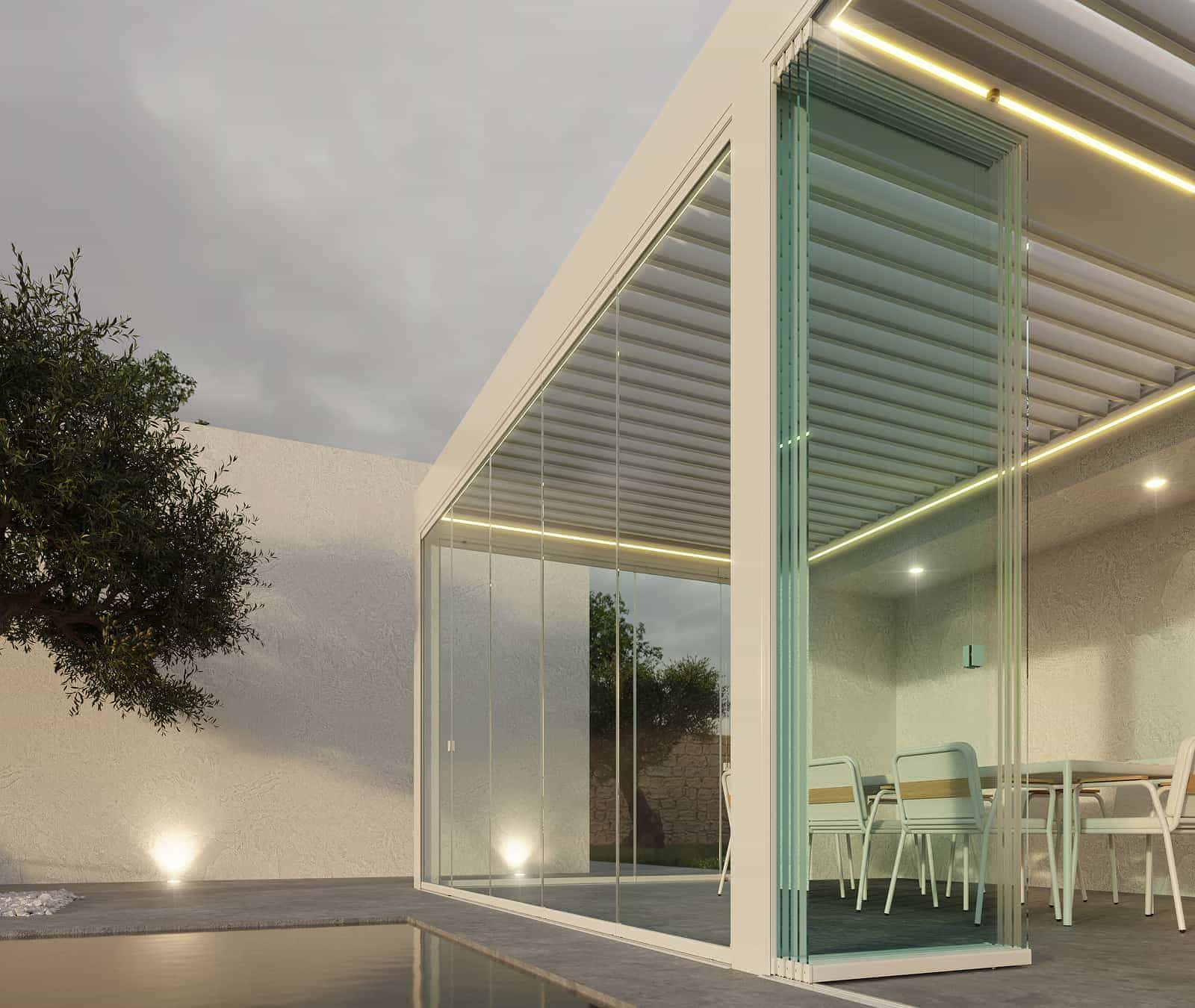 Adaptan espacios sin perder luminosidad, ni accesibilidad ni vistas. Fabricadas con vidrio templado, ofrecen seguridad, reducen el aislamiento térmico y acústico. Su diseño sin perfiles verticales aporta una estética moderna y permite apertura total o parcial.